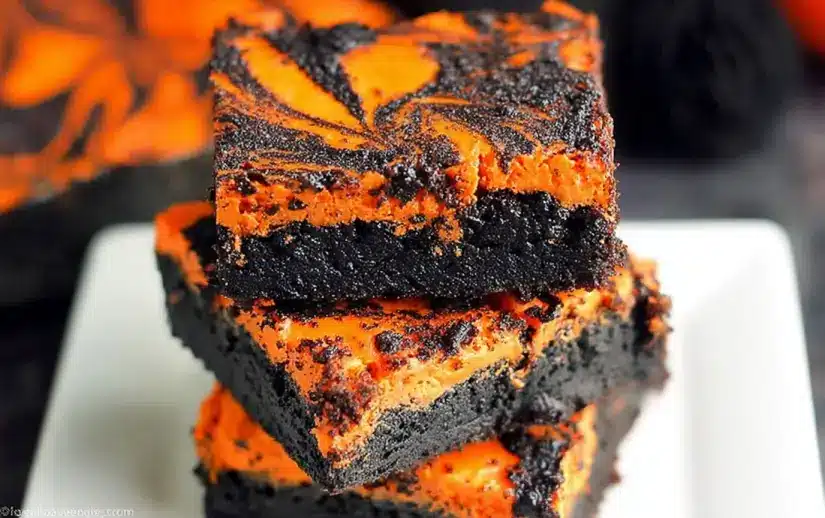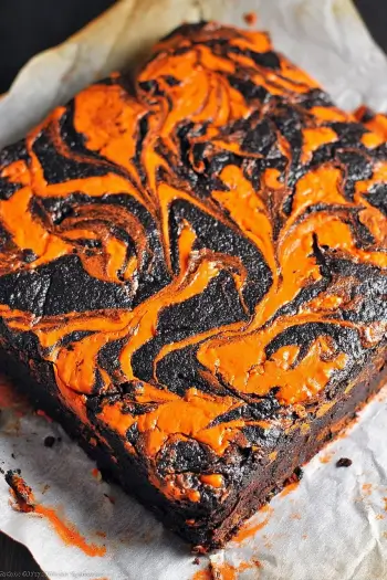 Rich, fudgy brownies swirled with vibrant orange-tinted cream cheese for a spooky and delicious Halloween treat!