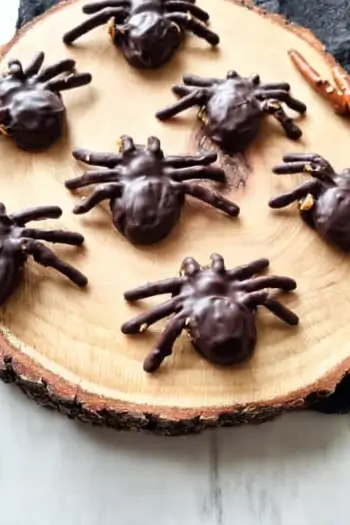 Now comes the fun part. Gently dip each spider top-down into the melted chocolate. Make sure the legs get coated, and if you want them extra chocolatey, you can submerge the entire spider.