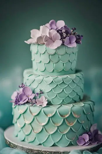 - Arrange fondant mermaid scales in an overlapping pattern along the cake tiers