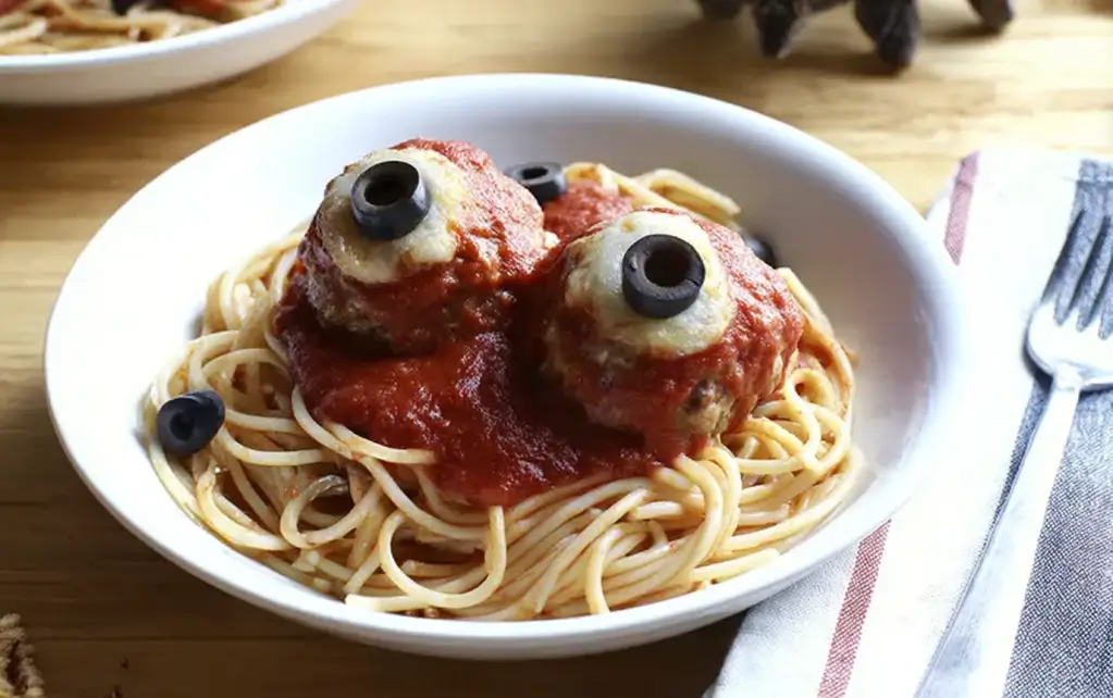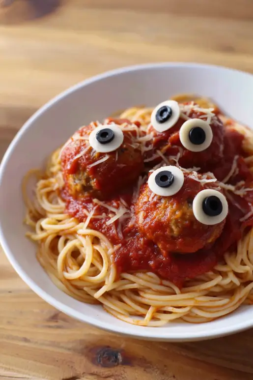 We’re talking spaghetti tangled like mummy wrappings, meatballs staring back at you with mozzarella and olive eyeballs. Yup, dinner is looking at you—and trust me, it’s delicious.
